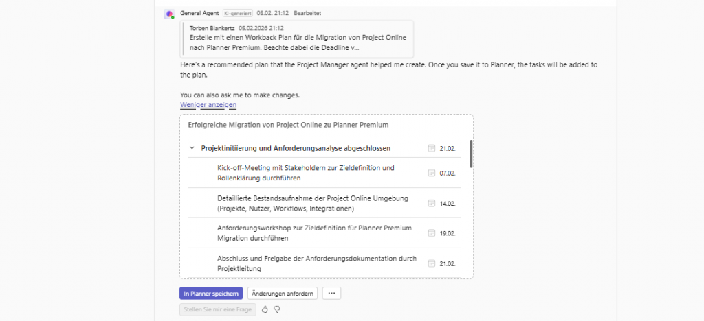 „Erstelle mir einen Workback Plan für die Migration von Project Online nach Planner Premium. Beachte die Deadline vom 30.09.2026. Lass bitte einen Puffer von zwei Wochen einfließen, damit die Abnahme rechtzeitig erfolgt.“