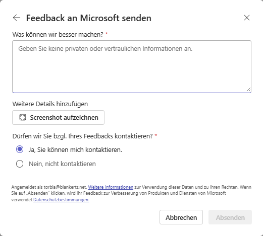 Im Februar wurde außerdem die Feedbackfunktion in Microsoft Planner & Project aktualisiert. Ab sofort kannst du Anhänge direkt an Feedback an Microsoft dranhängen – vorausgesetzt, die Feedbackfunktion ist in deiner Organisation in den Microsoft 365-Richtlinien entweder „Nicht konfiguriert“ oder „Erlaubt“. Wenn die Feedbackmöglichkeit deaktiviert wurde, bleibt diese Option natürlich weiterhin gesperrt. Ansonsten hat sich an der bisherigen Feedbackfunktion nichts geändert, sodass keine zusätzlichen administrativen Schritte nötig sind.