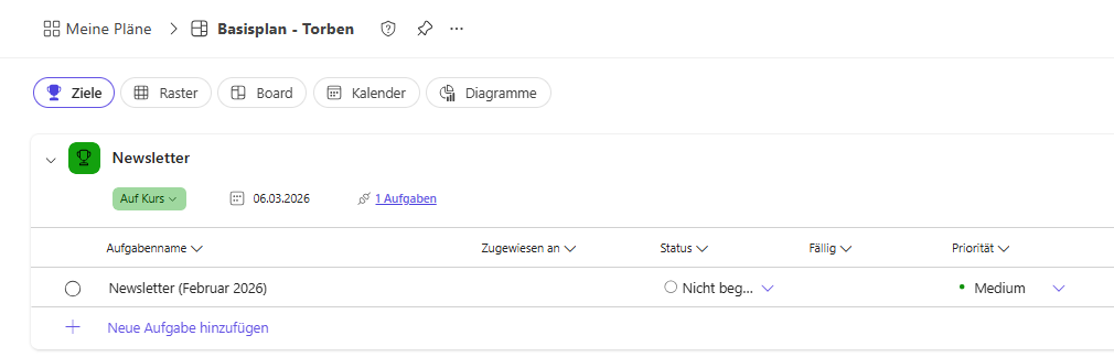 Ebenfalls haben jetzt auch die Basispläne das Feature „Ziele“ bekommen. Damit kannst du die Zielansicht endlich auch in ganz normalen Basisplänen nutzen. Und by the way: Da wir in Standardplänen bisher keine Möglichkeit hatten, Meilensteine sauber abzubilden, kannst du solche Arbeitspakete jetzt ganz einfach als Ziele hinzufügen. Damit wird die Planung deutlich übersichtlicher und du bekommst einen viel klareren Blick auf entscheidende Meilensteine im Projekt.