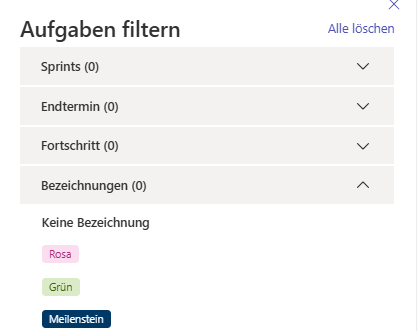 Um die markierten Meilensteine zu filtern, klicke auf „Filter“ und wähle dort „Bezeichnungen“ aus. Wähle nun die zuvor erstellte Bezeichnung „Meilenstein“. Dadurch werden alle Meilensteine im aktuellen Projektplan übersichtlich herausgefiltert und angezeigt.