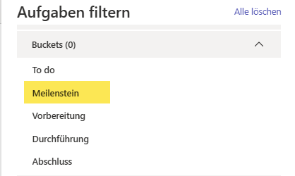 Abschließend kannst du die Meilensteine gezielt filtern, indem du auf „Filter“ klickst, im Kontextmenü die Option „Buckets“ auswählst und schließlich den zuvor angelegten Bucket „Meilenstein“ markierst. Dadurch werden dir ausschließlich die Meilensteine angezeigt und du behältst stets den Überblick über die wichtigsten Termine und Eckpunkte deines Projekts.