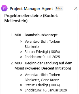 Auch der Project Manager Agent (PMA) kann dich bei der Suche nach Meilensteinen unterstützen. Zwar ist es derzeit nicht möglich, mithilfe des Agents direkt Filterungen im Plan vorzunehmen, dennoch bietet er eine praktische Alternative: Der Agent kann dir eine prägnante Übersicht der aktuellen Meilensteine liefern. Dafür genügt es, den Prompt „Erstelle mir eine Übersicht aller Meilensteine des Projektes!“ einzugeben. Im Anschluss erhältst du eine vollständige und übersichtliche Zusammenstellung der Meilensteine, sodass du ohne zusätzliche Filter schnell den gewünschten Überblick bekommst.